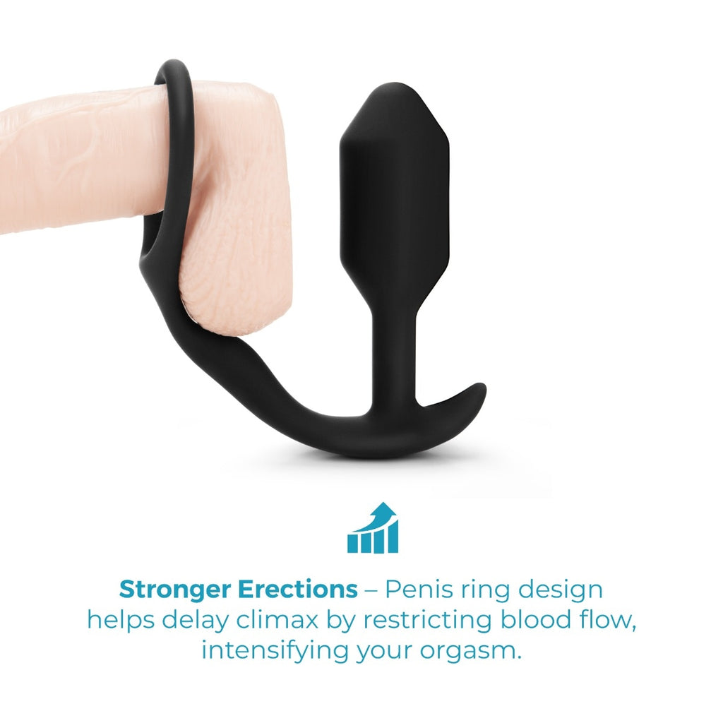 Made from 100% body-safe silicone, the b-Vibe Snug & Tug delivers longer, stronger erections alongside that sensual feeling of fullness gained from weighted butt plugs.