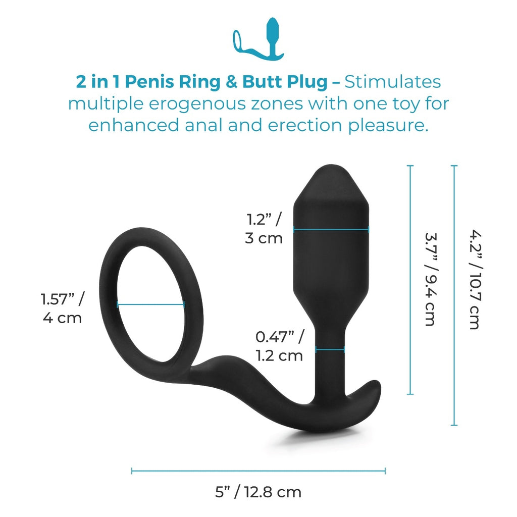 Modeled on the popular design of our weighted butt plugs, we incorporated a penis ring to bring you the b-Vibe Snug & Tug: