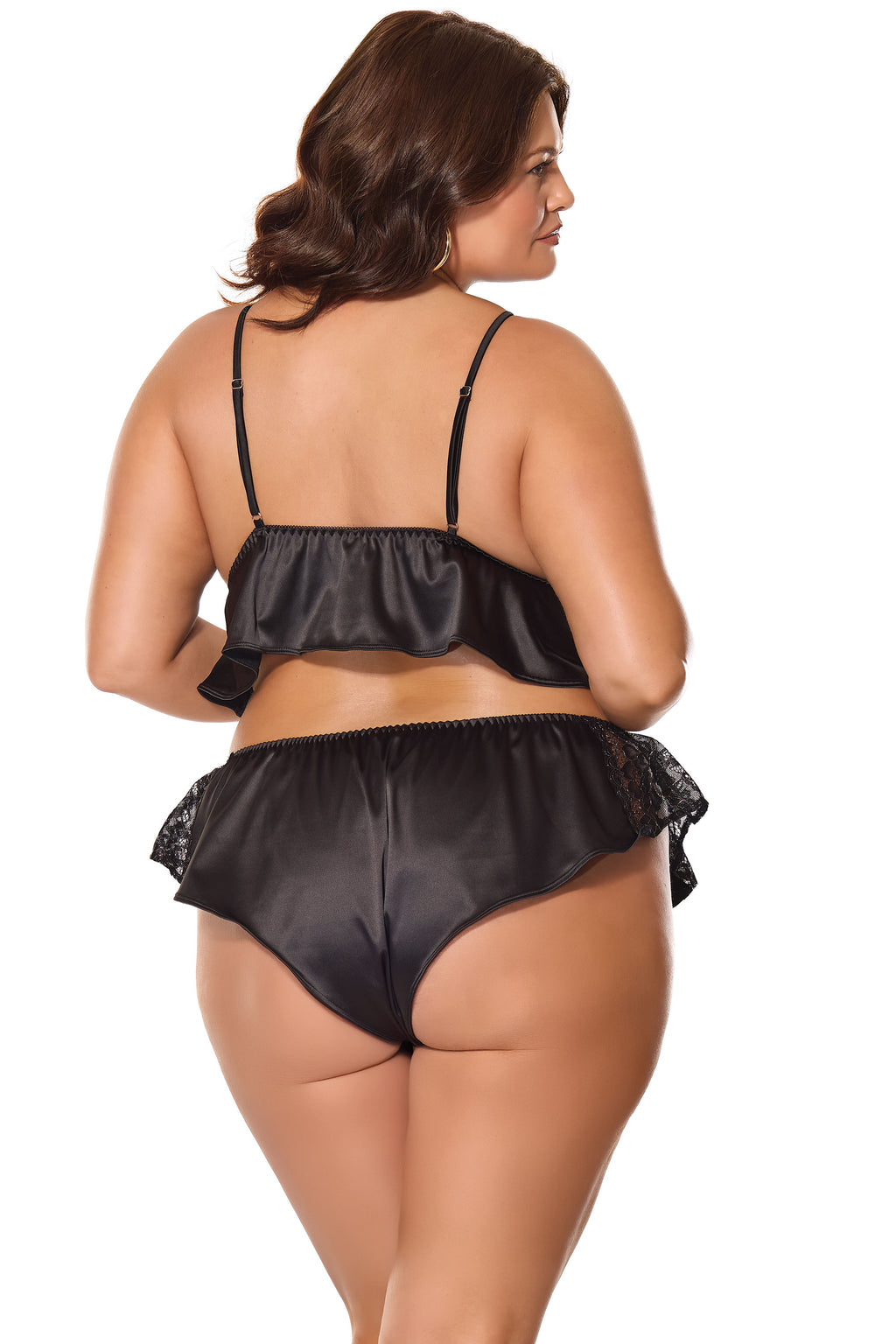 • Soft triangle cups • Peplum hem• Adjustable satin straps • Ruffled panty hem• Rose gold-tone hardware