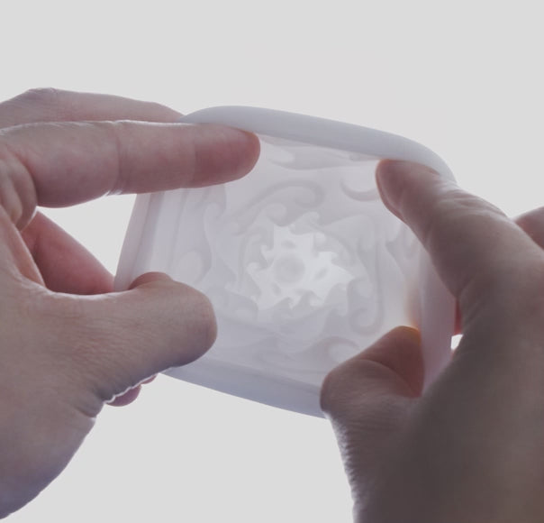 Start by opening the protective shell and removing the stroker; keep the shell if you wish to reuse it for storage.