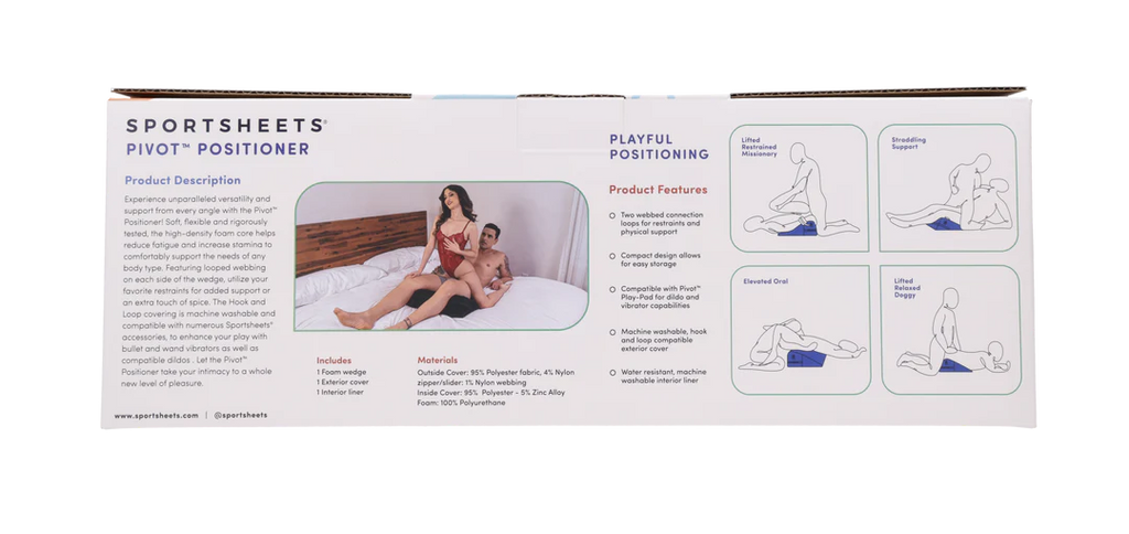 Experience unparalleled versatility and support from every angle with the Pivot Positioner! Soft, flexible and rigorously tested, the high-density foam core helps reduce fatigue and increase stamina to comfortably support the needs of any body type. Featuring looped webbing on each side of the wedge, utilize your favorite restraints for added support or an extra touch of spice. The Hook and Loop covering is machine washable and compatible with numerous Sportsheets accessories, to enhance your play with bullet and wand vibrators as well as compatible dildos. Let the Pivot® Positioner take your intimacy to all new levels of pleasure.