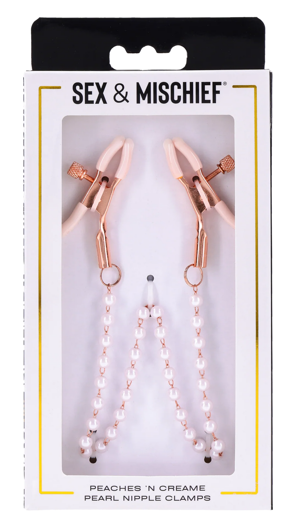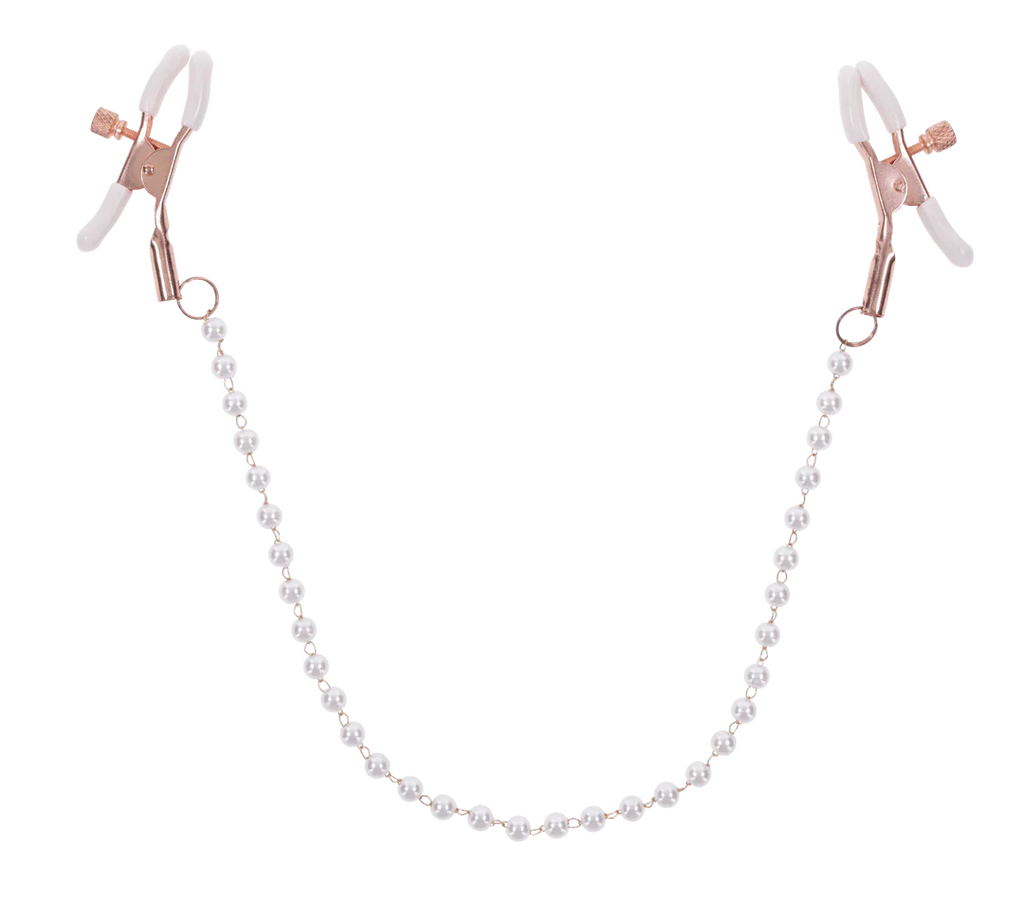 Take a tastefully tantalizing step into deeper sensations with the Peaches n’ CreaMe Pearl Nipple Clamps. Explore delicious sensitivity right where you want it most with dual adjustable clamps in stunning rose gold with pearl accents. White rubberized tips add a playful pop of color to your play and keep the clamps from slipping as you tease and pull your lovers chain, bringing intense feelings to their body.