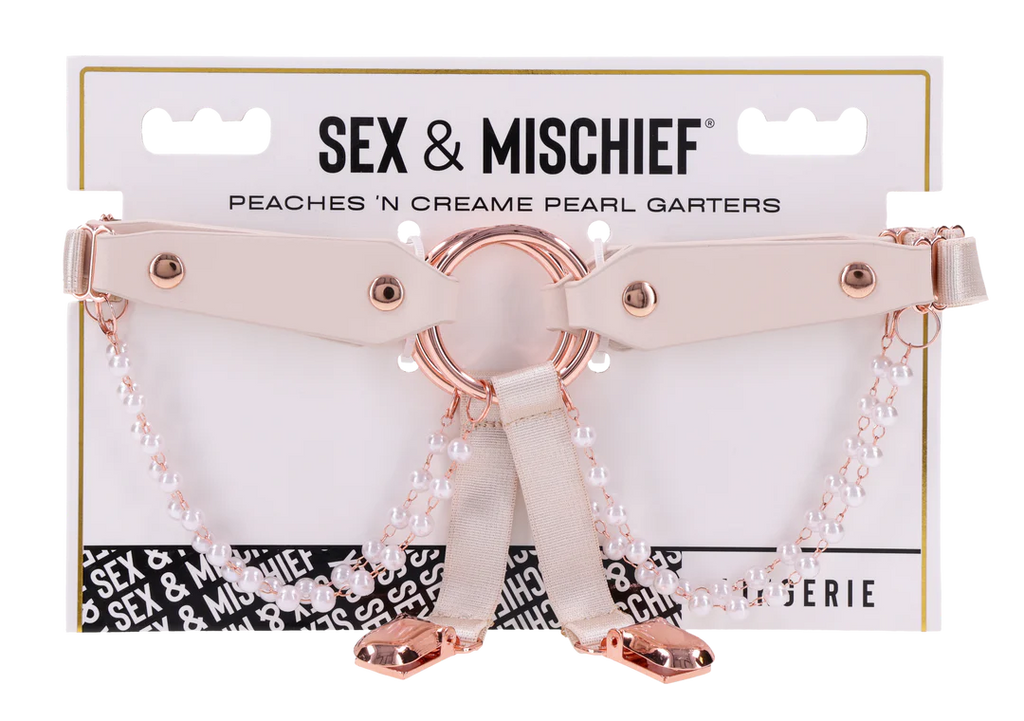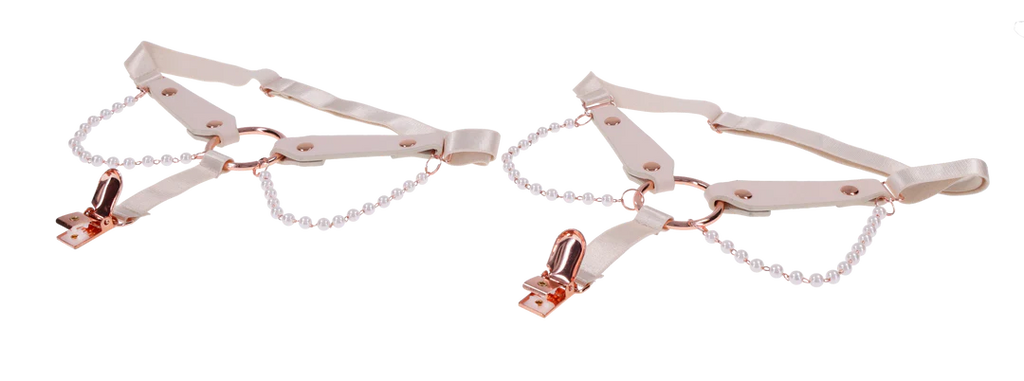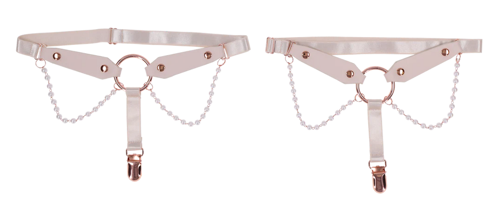 Sweet, sexy, and impossible to ignore, these luscious Peaches ‘N CreaMe Garters are made to turn heads and raise pulses. Crafted from soft faux leather and adorned with delicate pearl strands, a gleaming rose gold O Ring, and functional garter clips, they blend elegance with irresistible edge. Fully adjustable for a perfect fit, they wrap your thighs like a sensual secret, tempting anyone within view to take a closer look or a daring bite. The secure clips hold your thigh highs in place, letting you strut with confidence and command attention at every step. Seduce with style, tease with power, once they catch a glimpse, they’ll follow your lead without question.