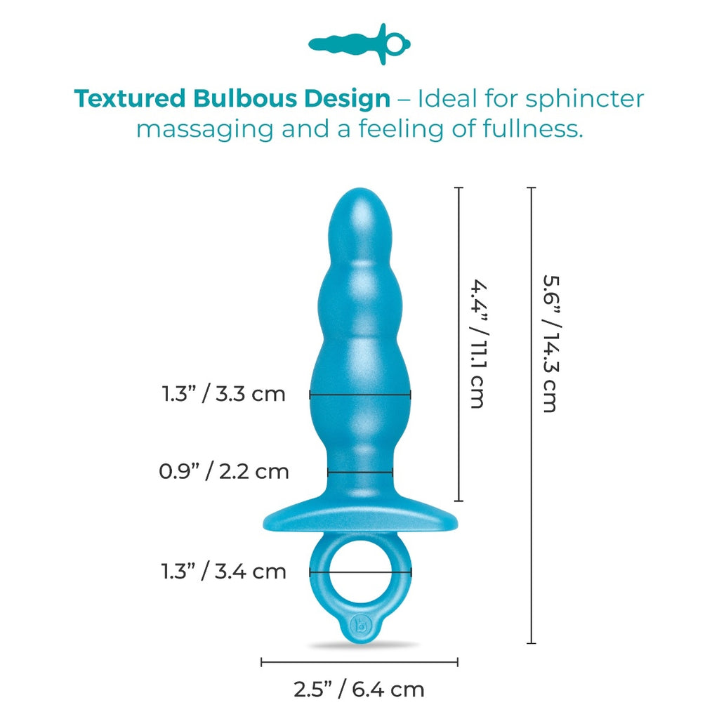 The remarkable combo of the super-soft, seamless silicone exterior, the ultra-thick tapered base, and the finger ring makes insertion and retrieval an effortless experience. Additionally, the b-Vibe Butties Bounce Silicone Beaded Plug is 100% waterproof and perfect for playtime in the bath or shower.