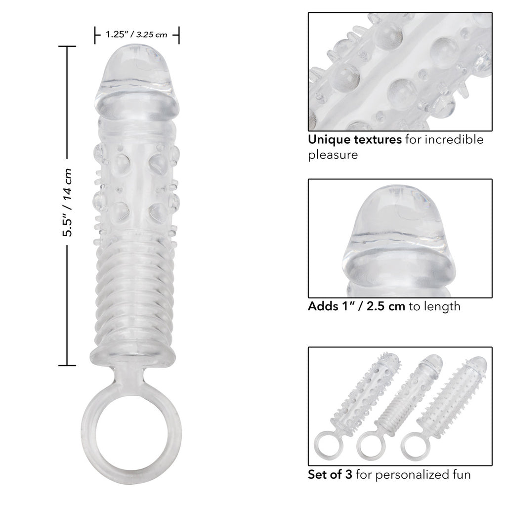 The 3 Piece Textured Extension Set is your key to unlocking new levels of pleasure, ensuring every encounter is as exhilarating as it is memorable.