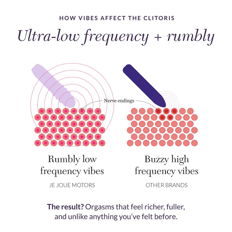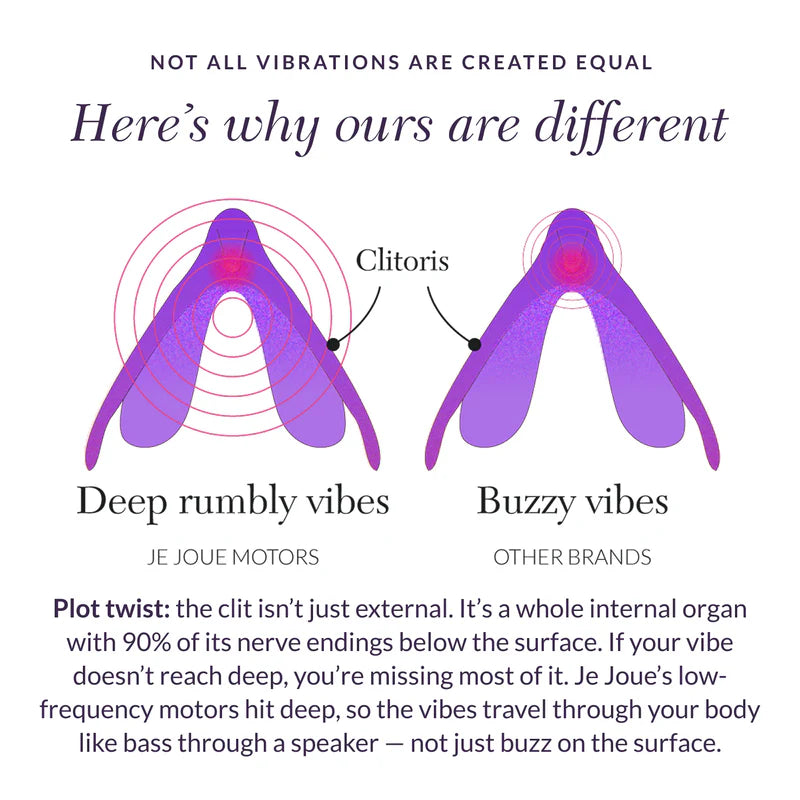 What truly distinguishes Mimi Deux is the deep rumble of its ultra-low-frequency vibrations, a signature Je Joue innovation. These vibrations stimulate the entire internal clitoris and G-spot for profoundly powerful orgasms, setting Mimi Deux apart from the superficial buzz of other vibrators.