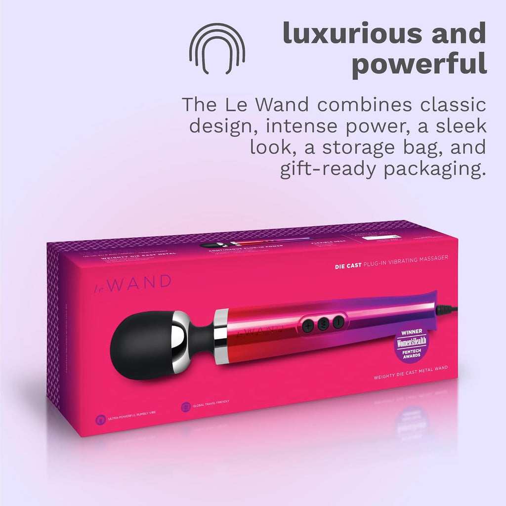 Plug-in for our most powerful wand yet! Le Wand Die Cast Plug-In Vibrating Massager is a heavier, more powerful adaptation of our award-winning wand. Featuring a cast metal body and amplified motor, this massager is perfect for those looking to take their pleasure collection to the next level.