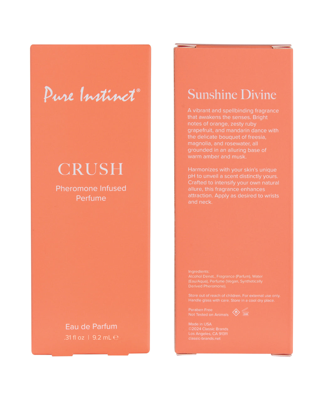 Pure Instinct CRUSH Pheromone Perfume Spray is a fragrance that awakens your senses with radiant energy. Bright bursts of zesty bergamot, sun-kissed mandarin, and ruby red grapefruit peel create a joyful opening, while soft whispers of freesia, magnolia, and rosewater bloom into an elegant, delicate heart. Grounded in the warmth of amber and the allure of soft cashmere musk, this spellbinding scent wraps you in a vibrant glow, effortlessly captivating and undeniably unforgettable.