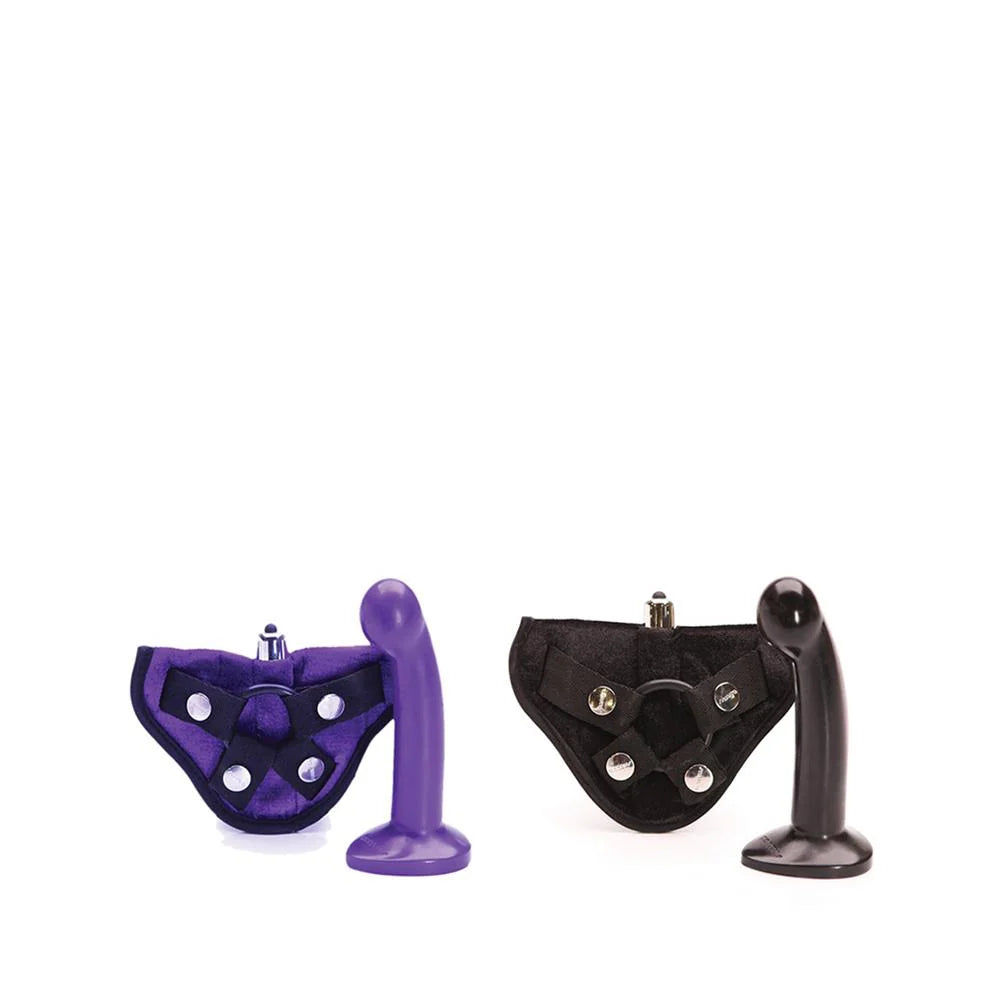 The Sport Kit has one smooth 100% Ultra-Premium Silicone Sport dildo designed for the G-Spot or prostate. The kit features a velvet harness which is comfortable, adjustable (fits hips up to 60” / 152 cm), and machine washable. It also comes with a 1.59” / 3.81 cm O-ring that can be changed for play with larger dildos as well as a built-in pocket that fits a bullet vibrator (included). The pocket holds the vibrator in place and allows access to the controls throughout your strap-on experience.